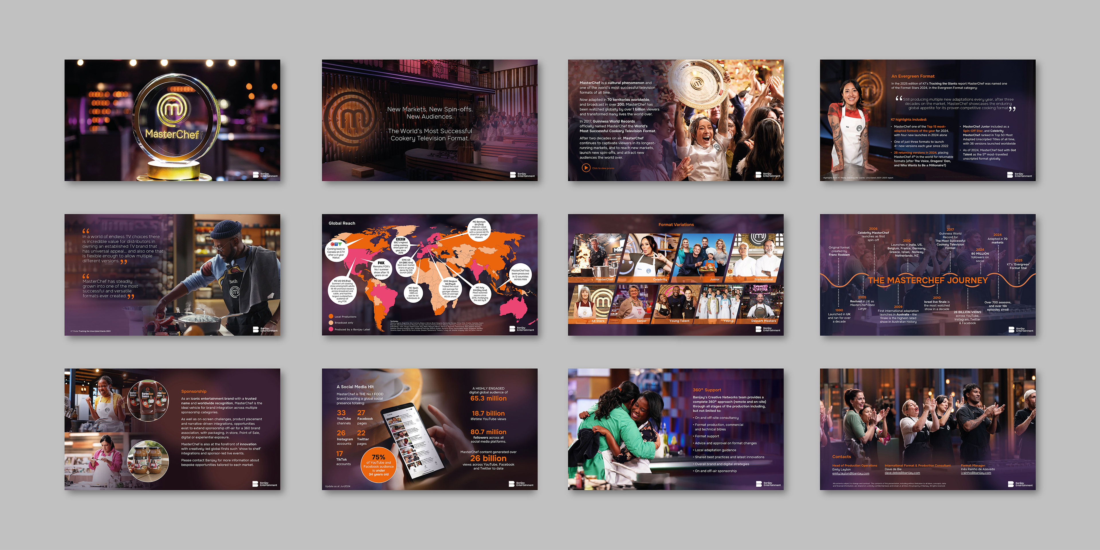 MasterChef required a sales deck that reflected both the drama of the television series and the brand’s global professionalism. The signature MasterChef orange, previously used as a primary color, was repositioned as a highlight rather than a dominant element. Paired with darker, complementary purples, the new palette brought greater depth and drama to the presentation.